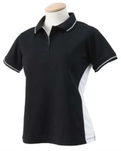 Devon & Jones Ladies' Dri-Fast Advantage Pique Polo Golf Shirt: 100% polyester pique with Dri-Fast Advantage moisture management keeps you cool and dry; contrast tipping on collar and cuffs; signature inside stripe collar tape; contrast side panels; side vents; half-moon mesh sweat catch; double-needle stitching on split-tail hem; shaped for the feminine figure.